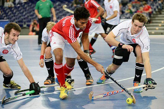 Le squadre schierano 11 giocatori che possono essere avvicendati da cinque elementi in panchina; le sostituzioni sono continue e senza limitazioni. La partita si svolge su 4 tempi della durata di 15 minuti ciascuno, con due pause di 1 minuto e un intervallo di 10 minuti. Il gioco consiste nel contendersi il possesso della palla (di plastica con una circonferenza di 230 mm) e colpirla con un apposito bastone in modo da farla entrare nella rete delle porte per segnare il punto. Non c’è la regola del fuorigioco.